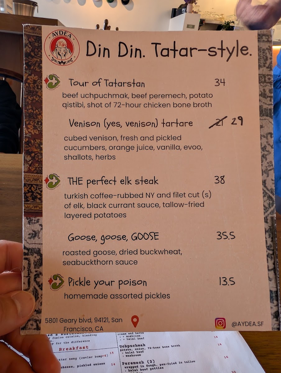 The menu at AyDea offers a selection of food and beverages characteristic of a cafe setting with a focus on Tatar cuisine. It includes a small but distinct food truck menu featuring items such as the Single Peremech, a traditional savory pastry.